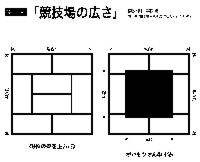 - 団体競技の競技場は、8枚の畳を正方形(3.6m×3.6m)に並べ、その中に2m×2mの赤いもうせんを敷いた広さ(または畳2畳の広さ)とする。この競技場内で2人が対戦する。(第1図「競技場の広さ」)競技場は、畳が最適であるが、畳がないところでは、木の床または地面でもよい。